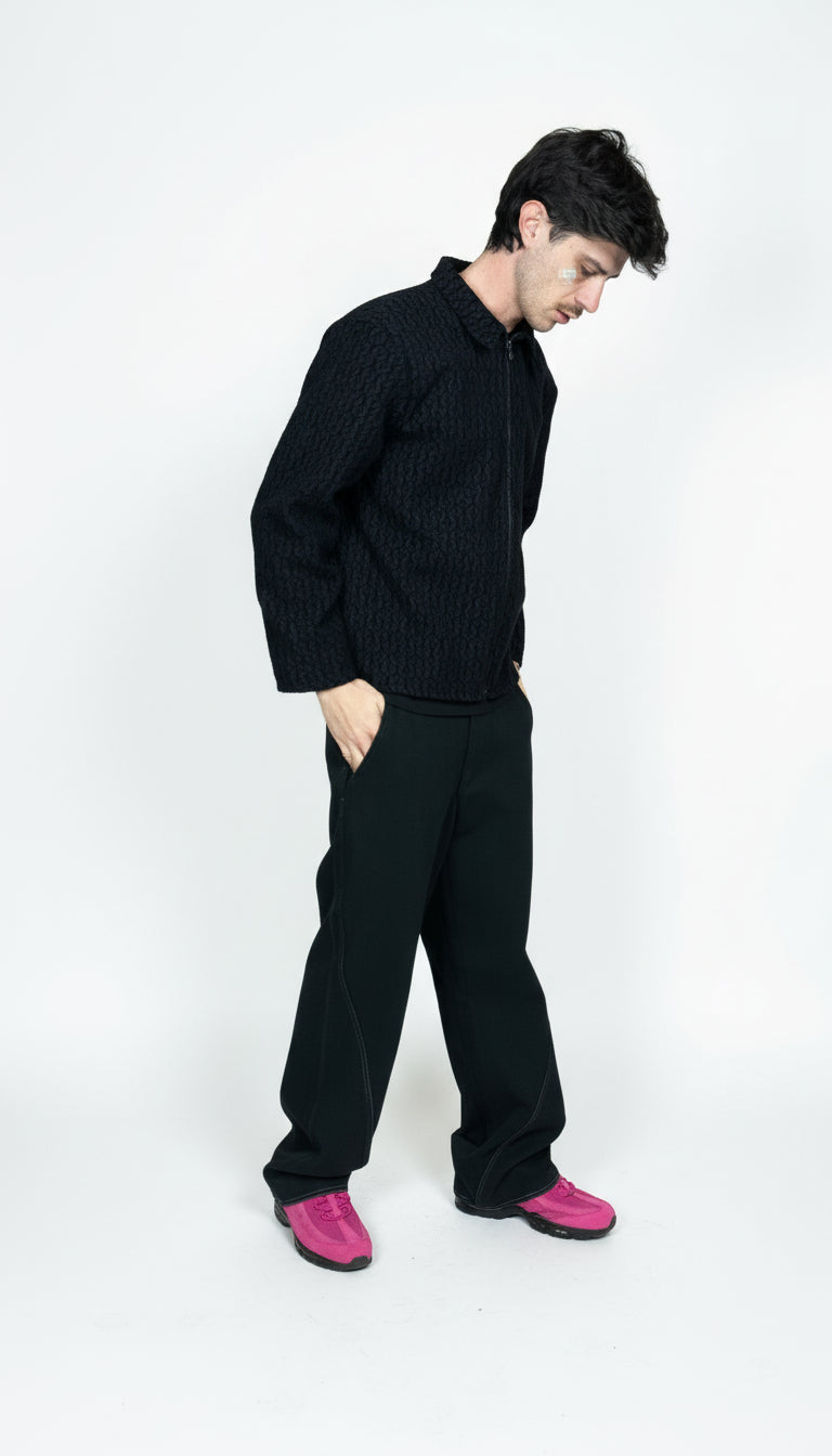 The jacket combines traditional fabrics such as woollens, jacquards, cottons, and boiled wool—often with a story behind them—with a squared, boxy fit inspired by modern streetwear. The absence of pockets enhances the clean and minimalist silhouette, designed for those who appreciate an essential yet striking style.
