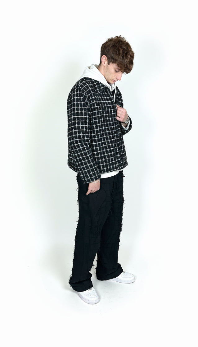 The jacket combines traditional fabrics such as woollens, jacquards, cottons, and boiled wool—often with a story behind them—with a squared, boxy fit inspired by modern streetwear. The absence of pockets enhances the clean and minimalist silhouette, designed for those who appreciate an essential yet striking style.